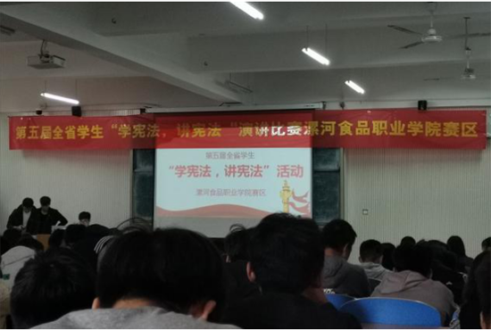为深入贯彻落实习近平总书记关于宪法学习宣传教育的系列重要指示精神,贯彻落实党的十九大和十九届二中、三中、四中全会精神,进一步在青少年学生中普及宪法知识、弘扬宪法精神、树立宪法权威,引导青少年学生自觉成为宪法的忠实崇尚者、自觉遵守者、坚定捍卫者。2020年10月30日中午12:40,我院在E号楼一楼南多媒体举办了以“学宪法,讲宪法”为主题的演讲比赛。学院团委副书记于书记、信息工程系团总支书记李书记、经济管理系团总支书记刘书记、食品检查系团总支书记谢书记、团委社团管理部长陈老师、学生处老师陈老师、团委宣传委员赵老师出席本次活动,活动由共青团漯河食品职业学院委员会举办。