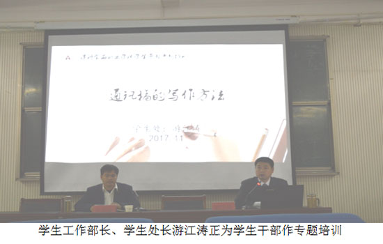 为了进一步提高学生对校园生活的关注,促进校园文化生活的繁荣,提高学生干部的新闻写作能力和技巧,2017年11月9日,我院学生干部“领导力专题培训”在北校区学术报告厅举行。本次培训由学生处长游江涛亲自授课,院团委副书记于金辉主持。