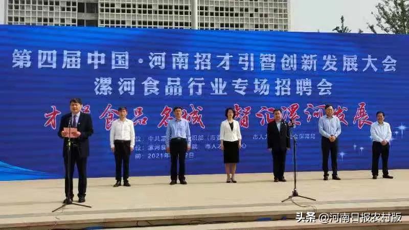 河南日报农村版讯(记者 仵树大 通讯员 王永强)为助力中国食品名城建设,推动漯河食品产业高质量发展,5月12日,第四届中国·河南招才引智创新发展大会漯河食品行业专场招聘会开幕式在漯河食品职业学院隆重举行。市委常委、组织部部长吕娜,漯河食品职业学院党委书记、市委组织部常务副部长张国啸,省人才办副主任、省委组织部人才工作处处长高志刚,省人才交流中心主任冯以干出席开幕式。