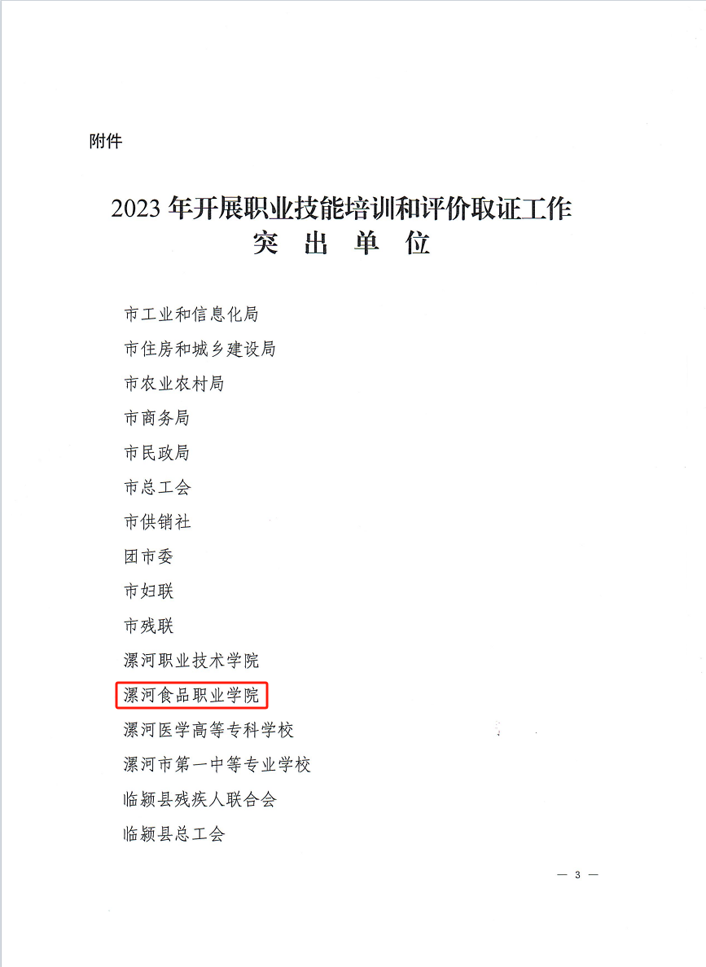 2024/03/09漯河食品职业学院被评为 “职业技能培训和评价取证工作突出单位”