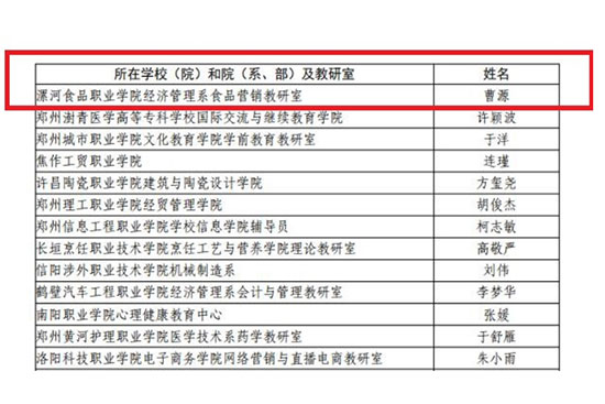 近日,中共河南省委教育工委河南省教育厅下发《关于公布2023年度全省教育系统“两创两争”活动先进集体和先进个人评选结果的通知》(豫教工委〔2023〕112号),经过申报评选推荐,组织资格审查,专家集中评审,网上公示等环节,表彰先进集体和先进个人,我院获评多项荣誉称号。其中,我系食品营销教研室曹源同志获评“...... 阅读(1970)