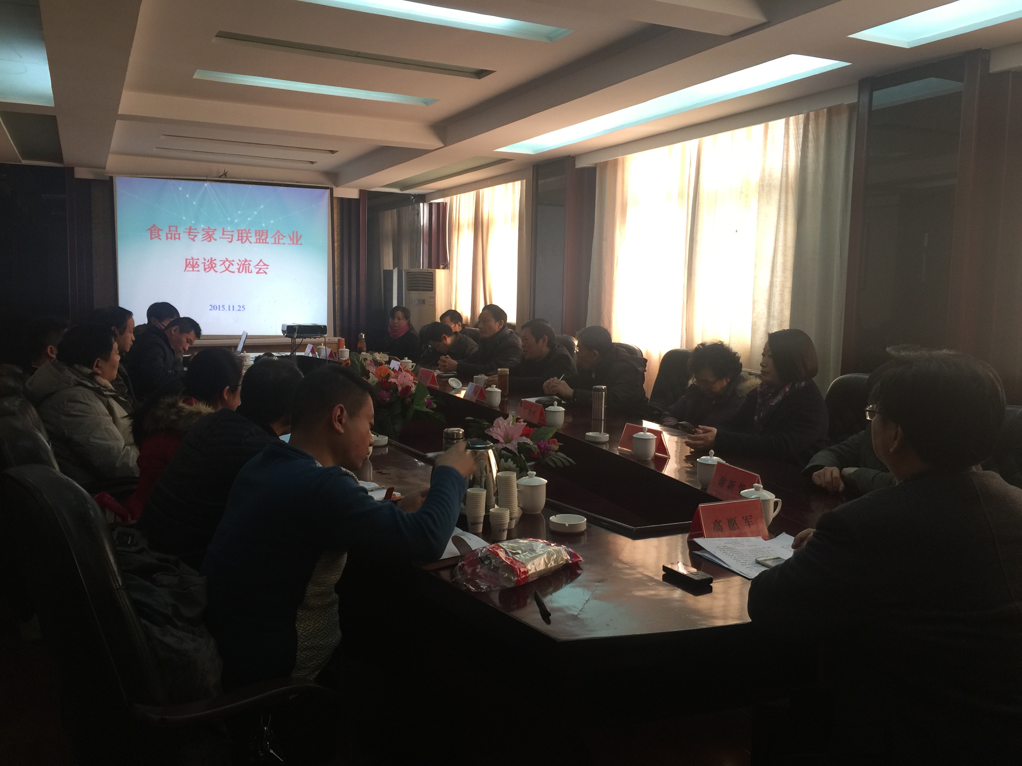 2015年11月25日, 漯河市食品产业知识产权战略联盟和漯河市食品产业技术创新战略联盟共同组织召开了食品专家与联盟企业座谈交流会。战略联盟理事长漯河食品职业学院党委书记詹跃勇、漯河市知识产权局局长刘保才出席会议,联盟秘书长高愿军主持会议。座谈会邀请了西北农林科技大学、河南工业大学、河南农业大学、广东开平健之源保健食品有限公司的食品专家,漯河市恒瑞化工有限公司、漯河大中原食品股份有限公司、河南三剑客奶业有限责任公司、漯河花花牛乳业有限公司、漯河永利食品有限公司、河南叮当牛食品有限公司、漯河三笑速冻食品有限公司、漯河乐佳食品科技有限公司等食品企业的技术副总和技术人员参加了座谈会。