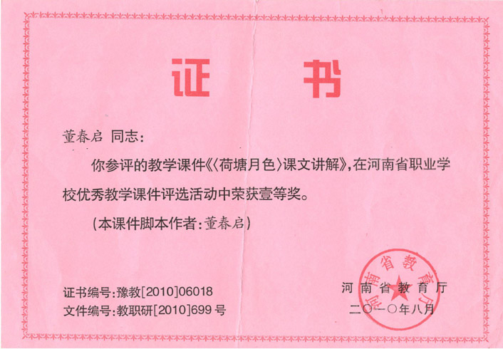 河南职业学校优秀教学课件荣获一等奖2010-董春启