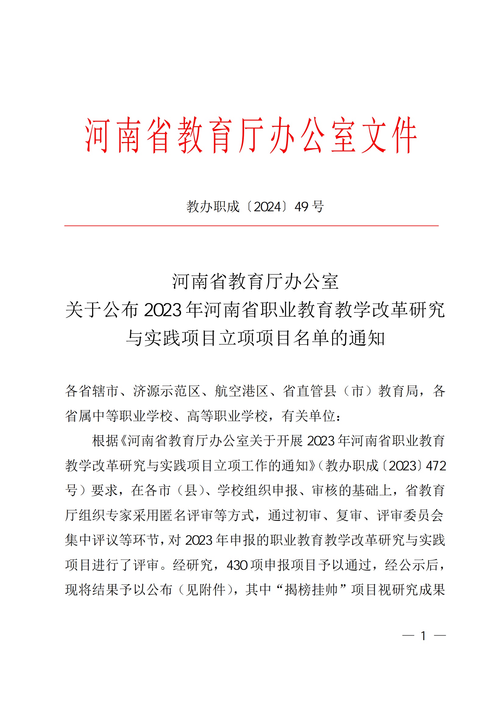 2024/03/26河南省教育厅办公室关于公布2023河南省职业教育教学改革研究与实践项目立项项目名单的通知