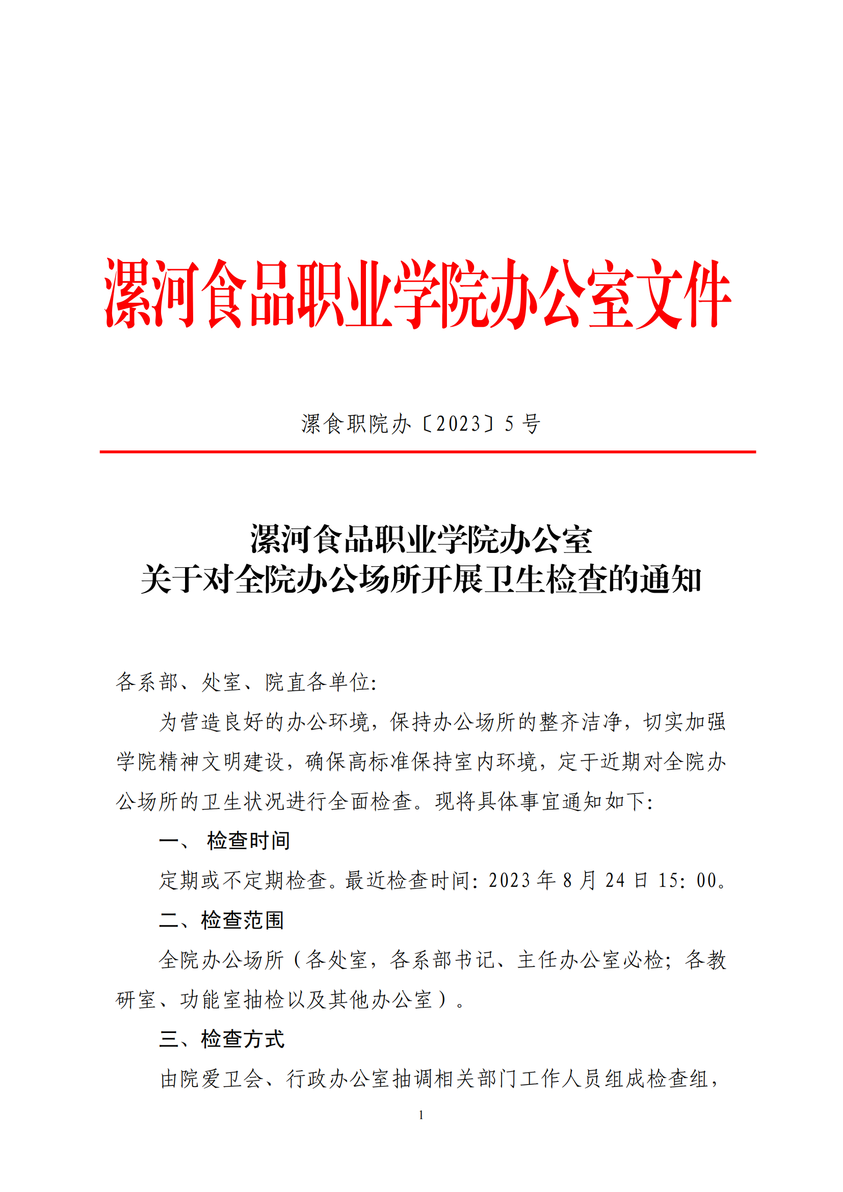 2023/08/23漯食职院办〔2023〕5号关于对全校办公场所开展卫生检查的通知