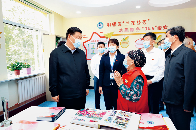 2020年6月8日至10日,中共中央总书记、国家主席、中央军委主席习近平在宁夏考察。这是6月8日下午,习近平在吴忠市利通区金花园社区党群活动服务中心,同社区志愿者代表亲切交谈。 新华社记者 鞠鹏/摄