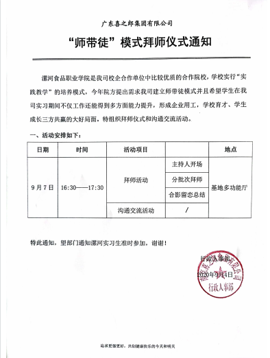 2020/10/19产教融合谱新篇,校企合作共育人--漯河食品职业学院食品加工技术专业现代学徒班拜师仪式