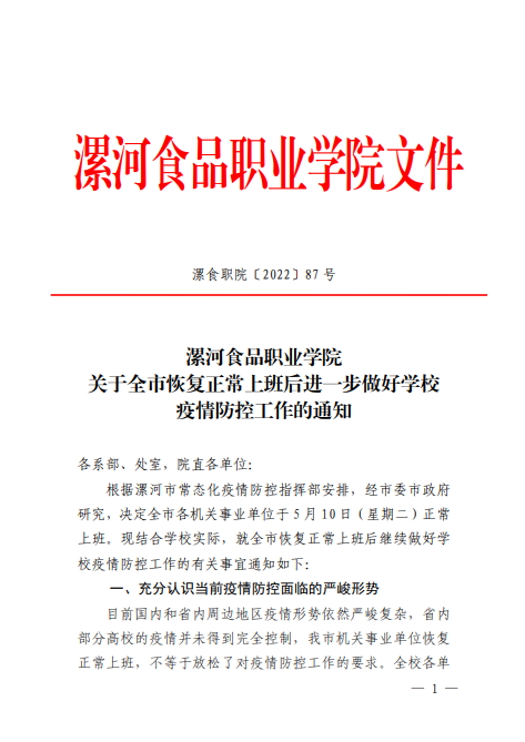 2022/05/11漯河食品职业学院关于全市恢复正常上班后进一步做好学校疫情防控工作的通知