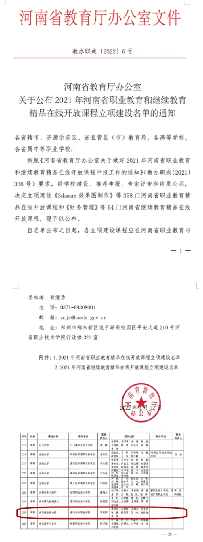 按照《河南省教育厅办公室关于做好2021年河南省职业教育和继续教育精品在线开放课程申报工作的通知》经学院建设、推荐申报、专家评审和结果公示,决定立项建设《3dsmax效果图制作》等358门河南省职业教育精品在线开放课程和《财务管理》等64门河南省继续教育精品在线开放课程,我系食品微生物检验在河南省职业教育与继续教育数字...... 阅读(1607)