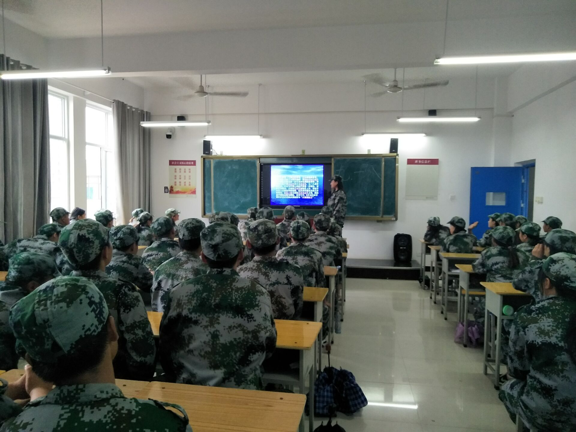 9时30分校园内奏响国歌,18级全体新生起立跟唱国歌。
