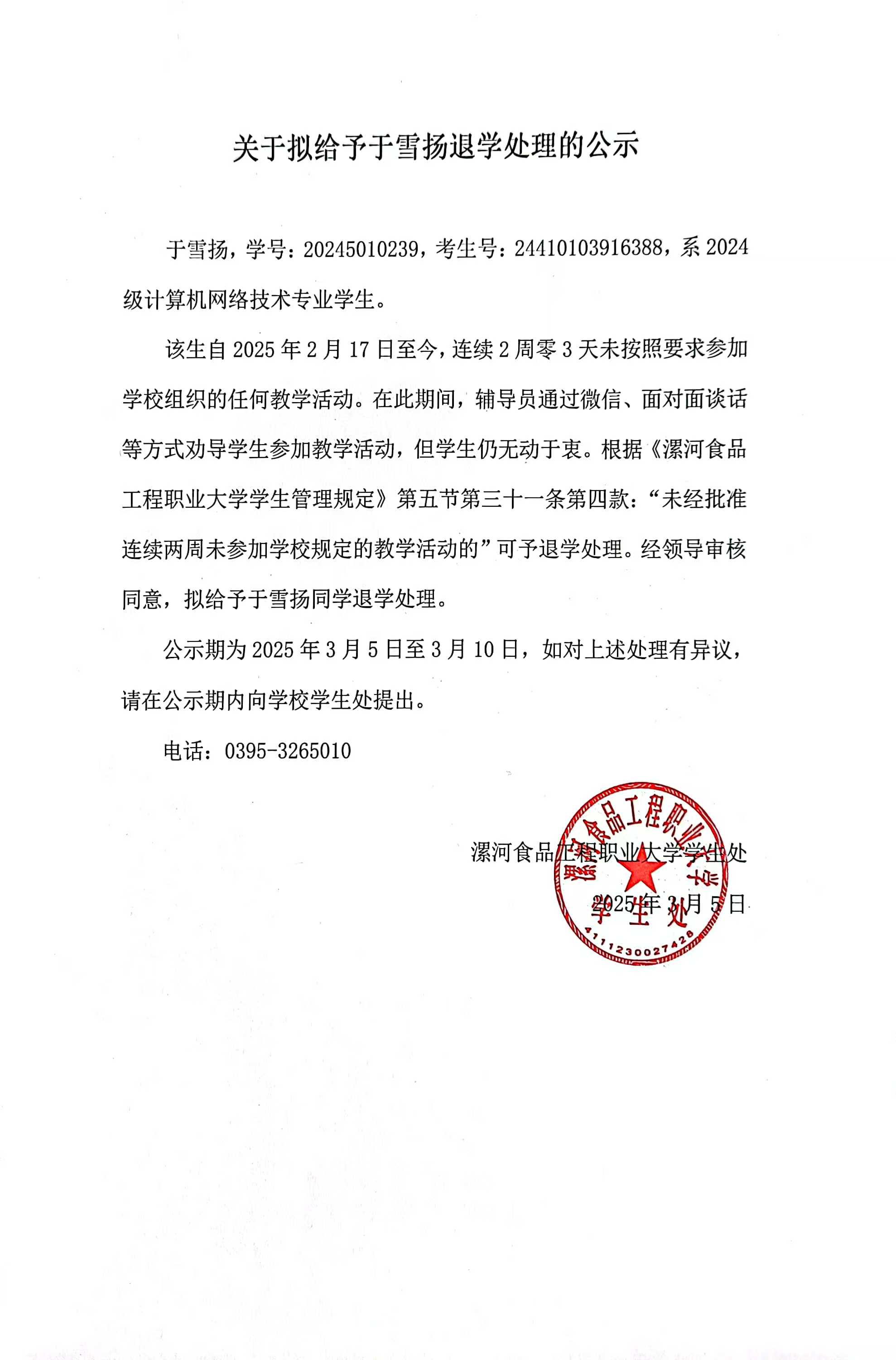 关于拟给与于雪扬退学处理的公示