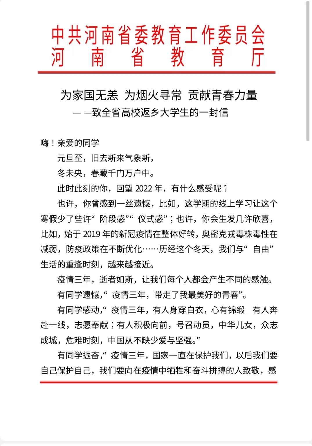 为家国无恙 为烟火寻常 贡献青春力量 ——致全省高校返乡大学生的一封信