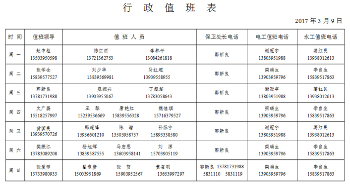 我院南校区行政值班将于3月13日正式开始,各行政值班人员,要按照《行政值班表》上的要求,在值班领导的带领下,尽职尽责,做好值班工作。