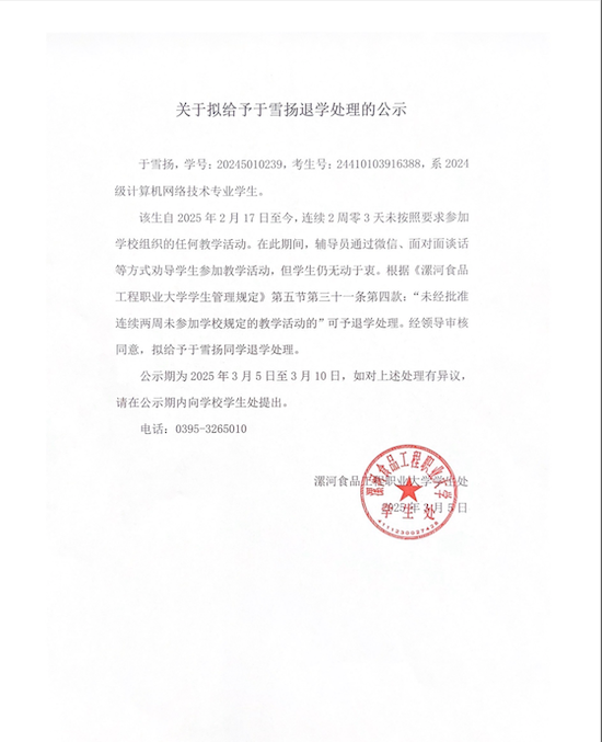 2025/03/06关于拟给予于雪扬退学处理的公示