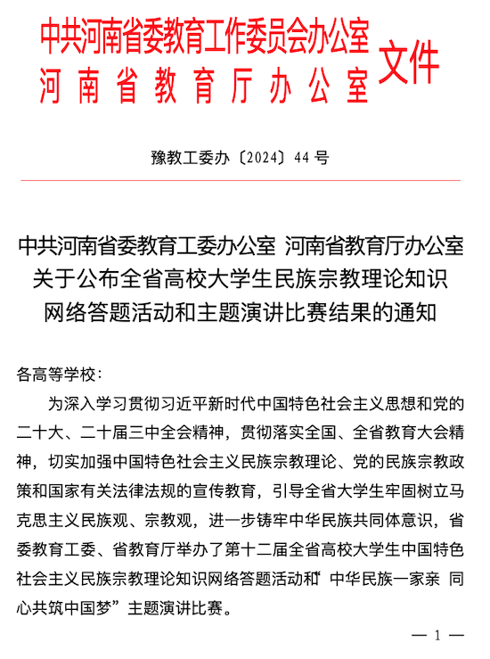 近日,中共河南省委教育工委办公室、河南省教育厅办公室下发《关于公布全省高校大学生民族宗教理论知识网络答题活动和主题演讲比赛结果的通知》(豫教工委办〔2024〕4... 阅读(859)