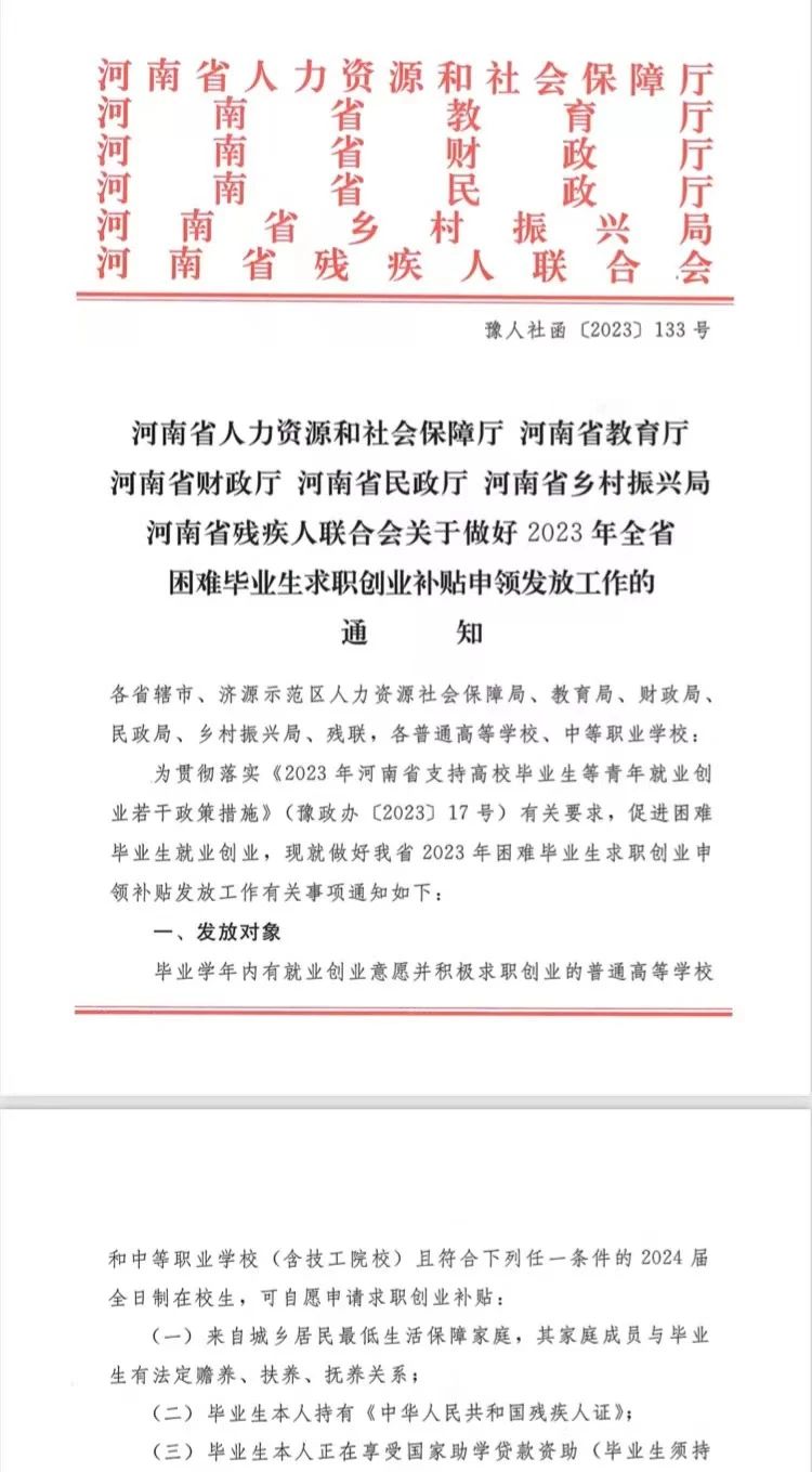 通知:根据河南省人力资源和社会保障厅、河南省教育厅、河南省财政厅、河南省民政厅、河南省乡村振兴局、河南省残疾人联合会等六部门联合印发的《关于做好2023年全省困难毕业生求职创业补贴申领发放工作的通知》(豫人社函〔2023〕133号)要求,现就做好williamhill英国官网2023年困难毕业生求职创业补贴申领发放工作有关事项通知如下:... 阅读(1385)