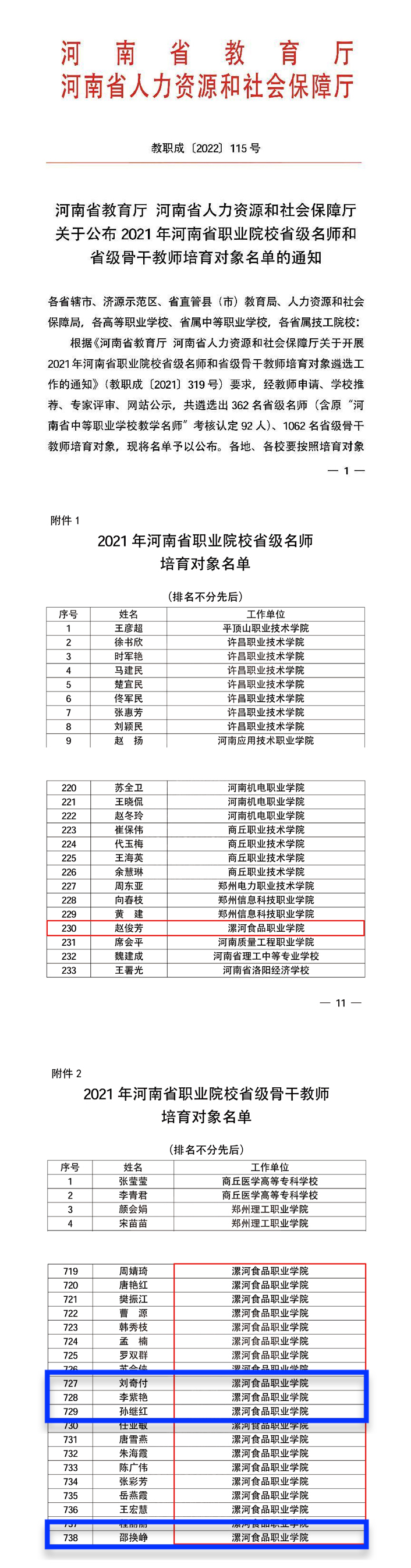2023/02/09漯河食品职业学院多名教师被遴选为省级名师和省级骨干教师培育对象