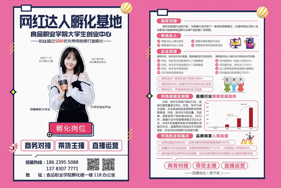 食品学院创业中心直播项目合作企业:恺雯文化传播有限公司孵化岗位:商务对接、带货主播、直播运营招聘人数:30人项目地点:学院创业中心、孵化楼岗位以【商务对接】为主,人员主要给公司合作的国内网红达人主播对接产品... 阅读(1076)